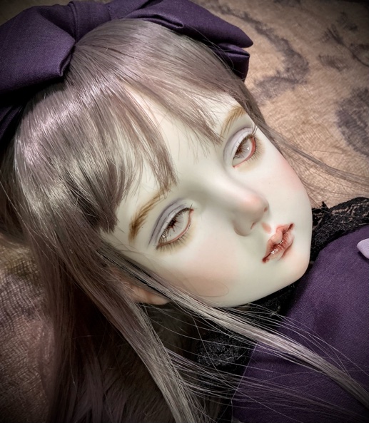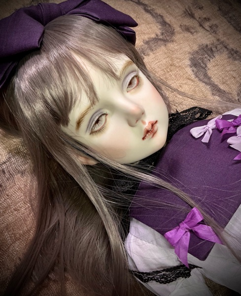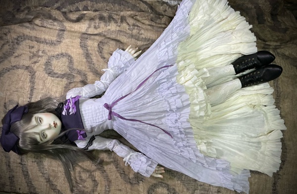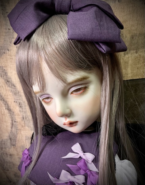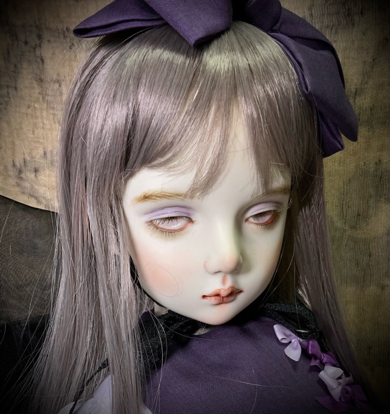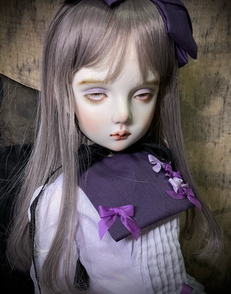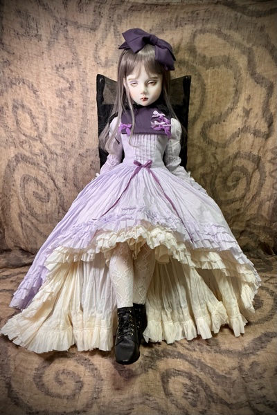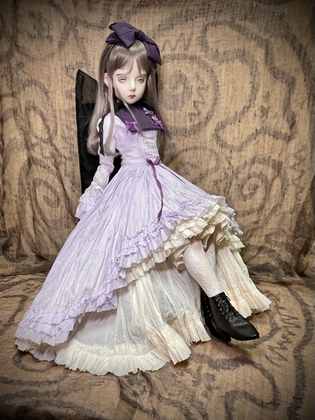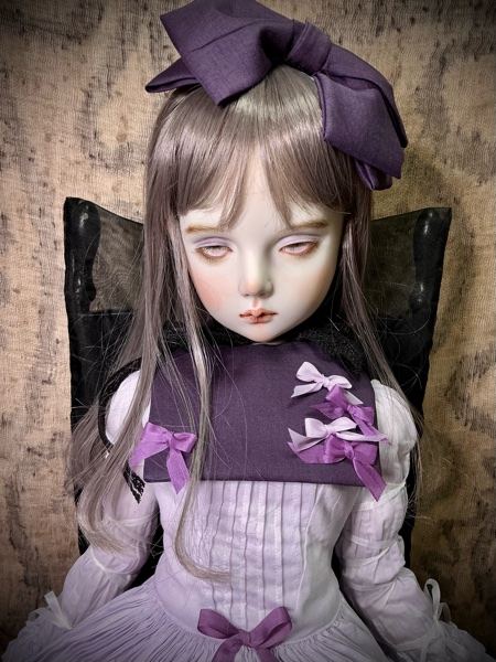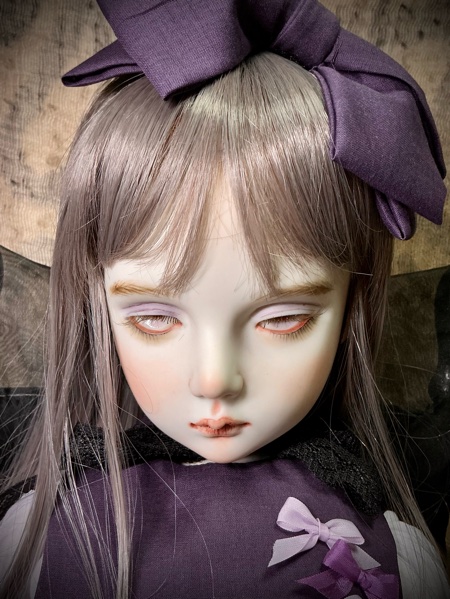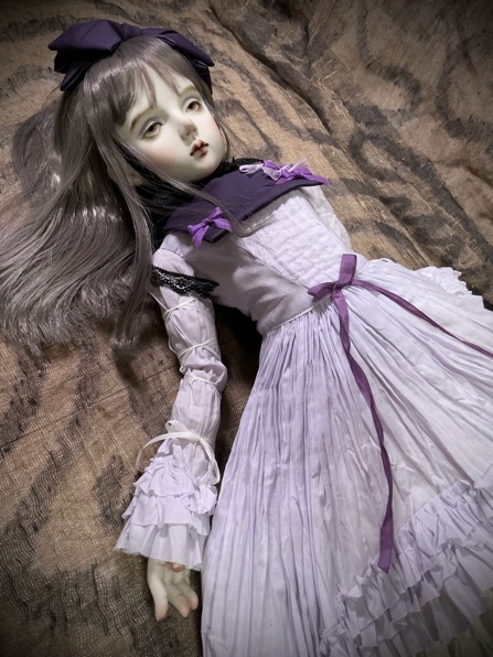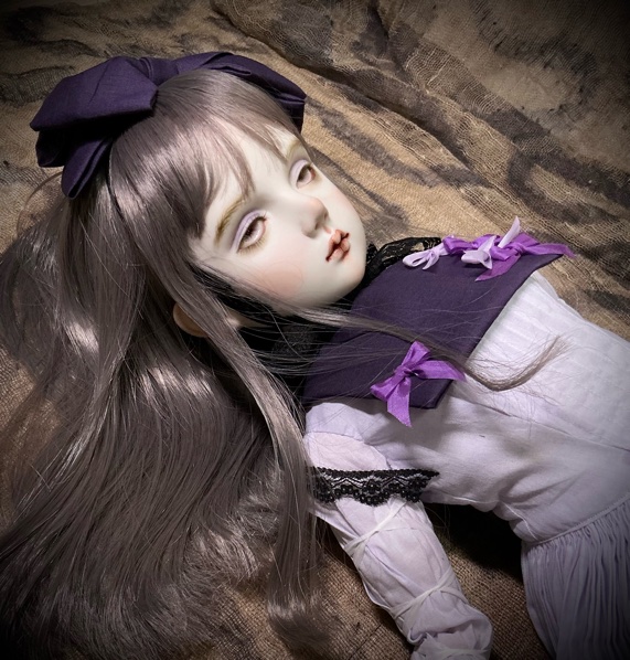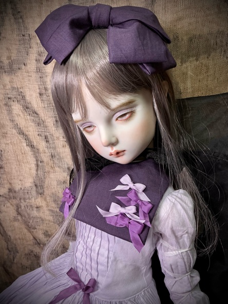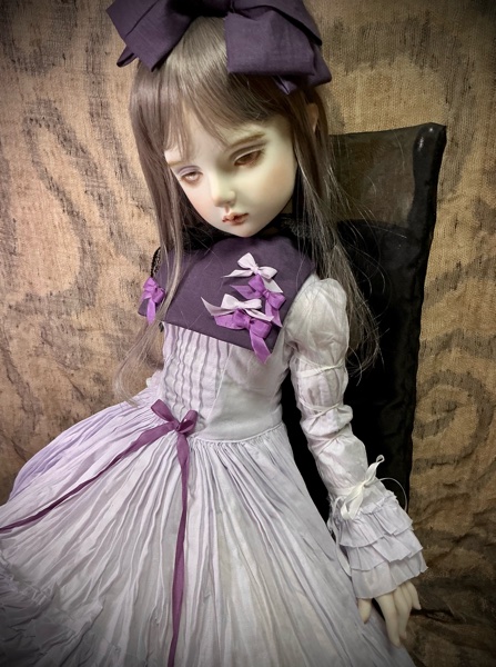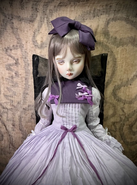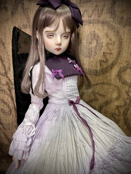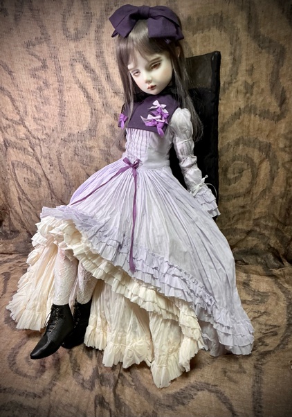 「少女幻想A80」A80(60p)オールビスク 20パーツヘア wig を着用しています 頭回りの前後左右に両面テープで止めています(wig の交換が可能です) 眼球(ビスクアイ) Pale purple 衣装80綿ローン ストレッチレース本革 etc